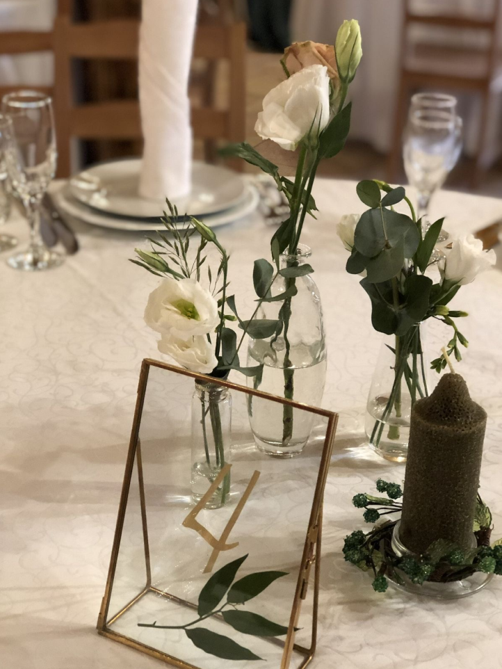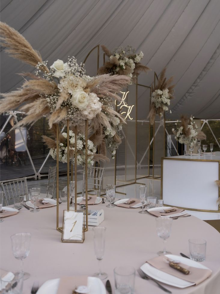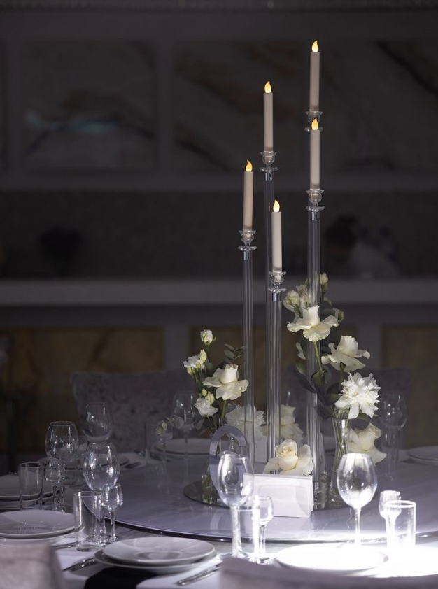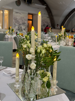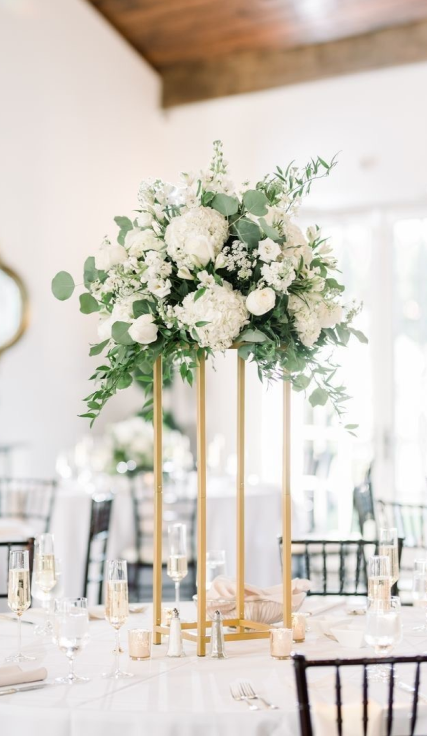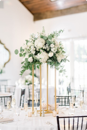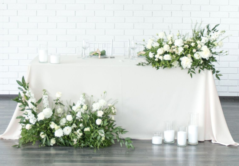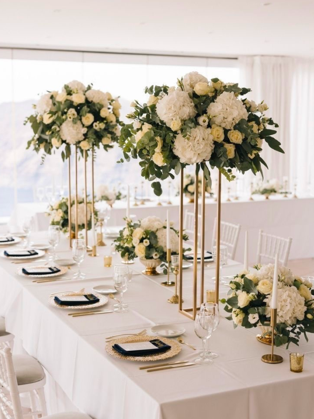Центральным украшением стола традиционно является композиции из цветов. В зависимости от стилистики свадьбы это могут быть букеты в вазах, вазонах, мартинницах, инсталляции в ящиках, сочетания с тематическими предметами (свечами, статуэтками, подсвечниками, часами, книгами и пр.), а так же большое разнообразие металических стоек. Оформление композиций может выполняться, как из живых, так и из искусственных цветов. Сорт и окрас цветов подбираются согласно главной идеи торжества.