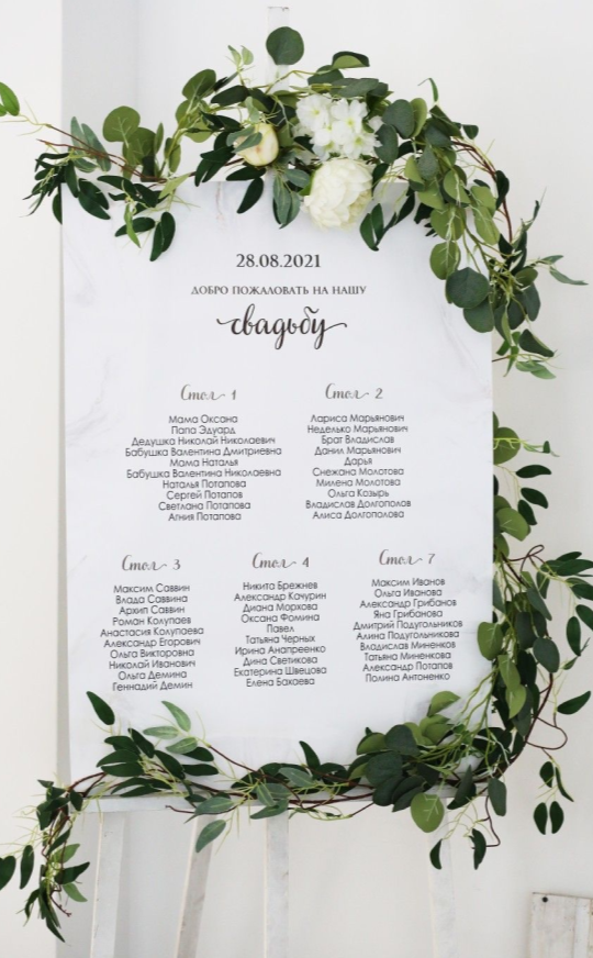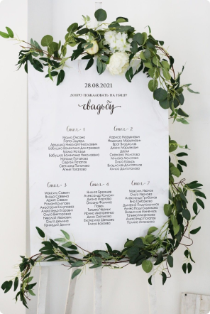 План представляет собой красиво, оригинально оформленную схему, на которой схематически изображены столы, расположенные в банкетном зале. Для каждого столика указан список с именами приглашенных. Гость находит на плане свое имя, узнает номер предназначенного для него стола и спокойно направляется к нему.
