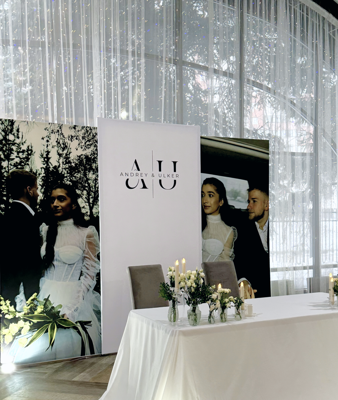 Так же вариант экрана (проектора) с красивым изображением или вашими фотографиями всегда будет выигрышно смотреться. Все выбранные фоны обязательно будут соответствовать тематике Вашей свадьбы.