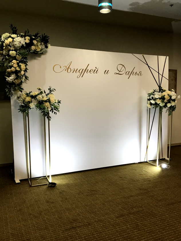 Сегодня мы широко используем разные, пластиковые ширмы, металлические конструкции с навесными цветами, ретро-гирляндами, изделия из пенопласта, деревянные фоны и другие конструкции.